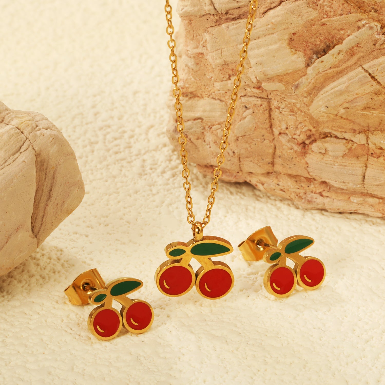 Set van ketting en oorbellen met kersmotief.