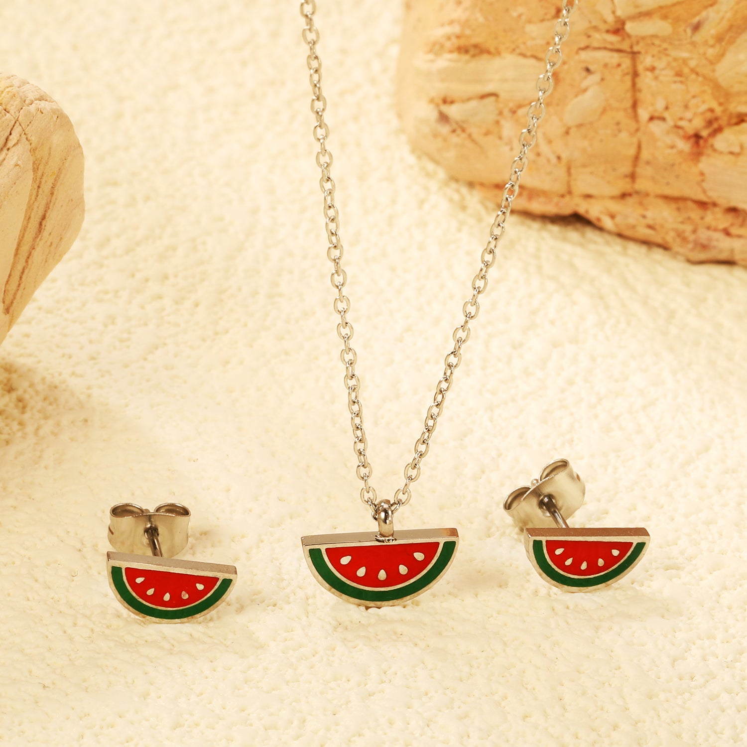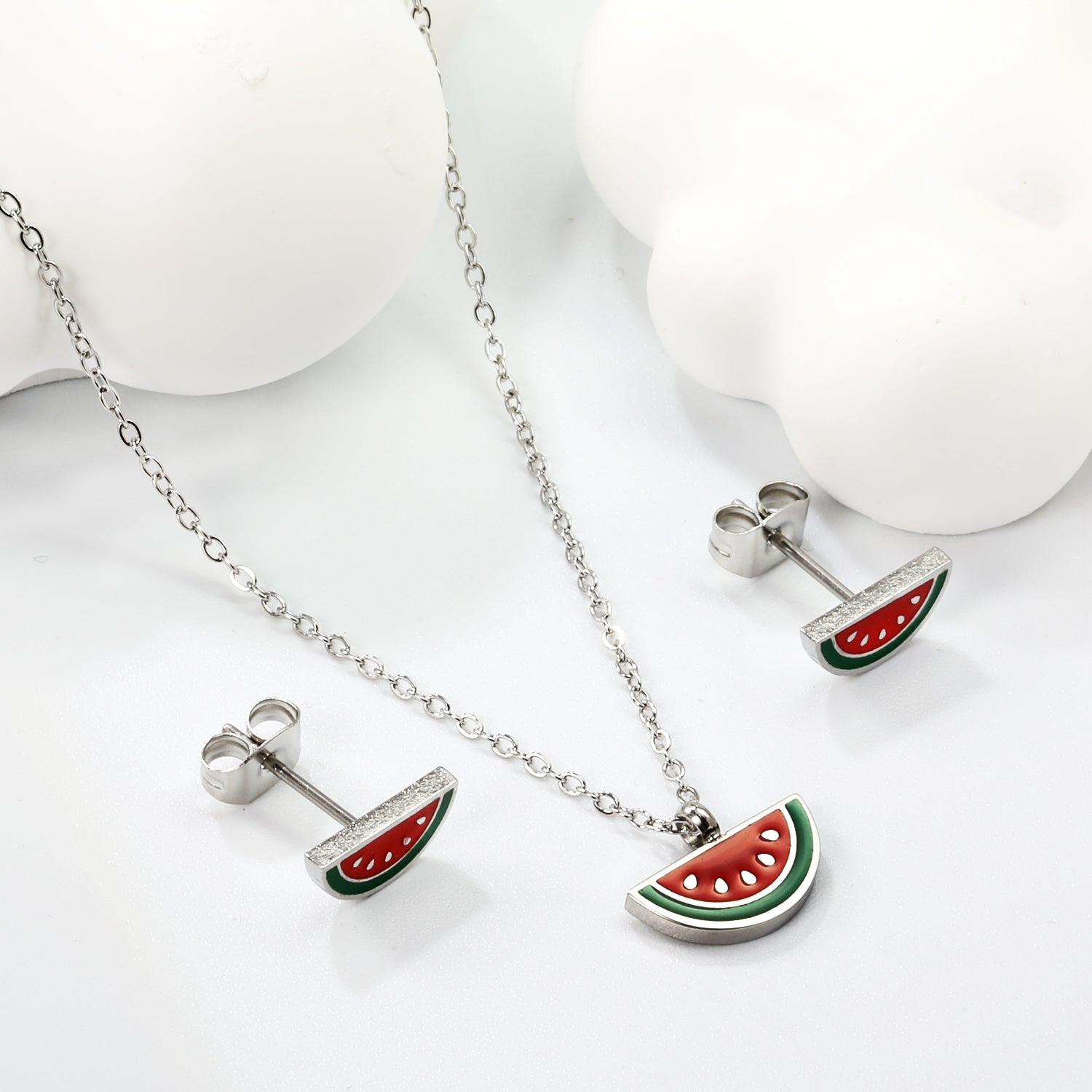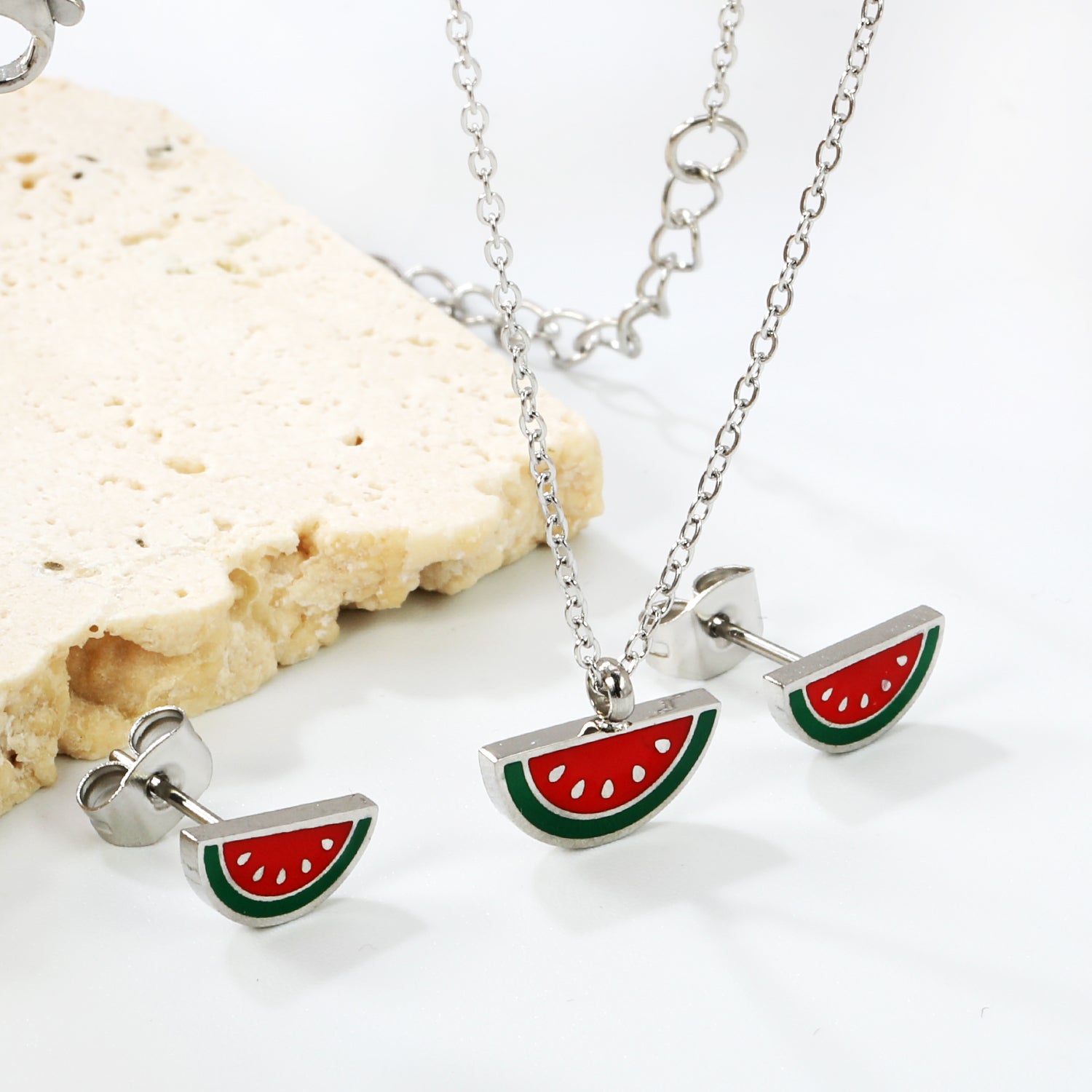 Zilverkleurige ketting en oorbellen met watermeloenontwerp.